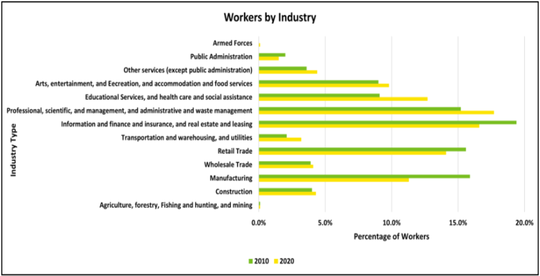 As a part of its daytime population, the village enjoys a large employment base from all industries. See below for data in 2010 versus 2020 about persons, age 16 and over, who live outside of the community and come into Schaumburg to work. The percentages are based on employment totals of 73,951 persons in 2010 and 69,959 in 2020. The information below was prepared by Rob Paral and Associates and gathered from the American Community Survey at the U.S. Census Bureau.